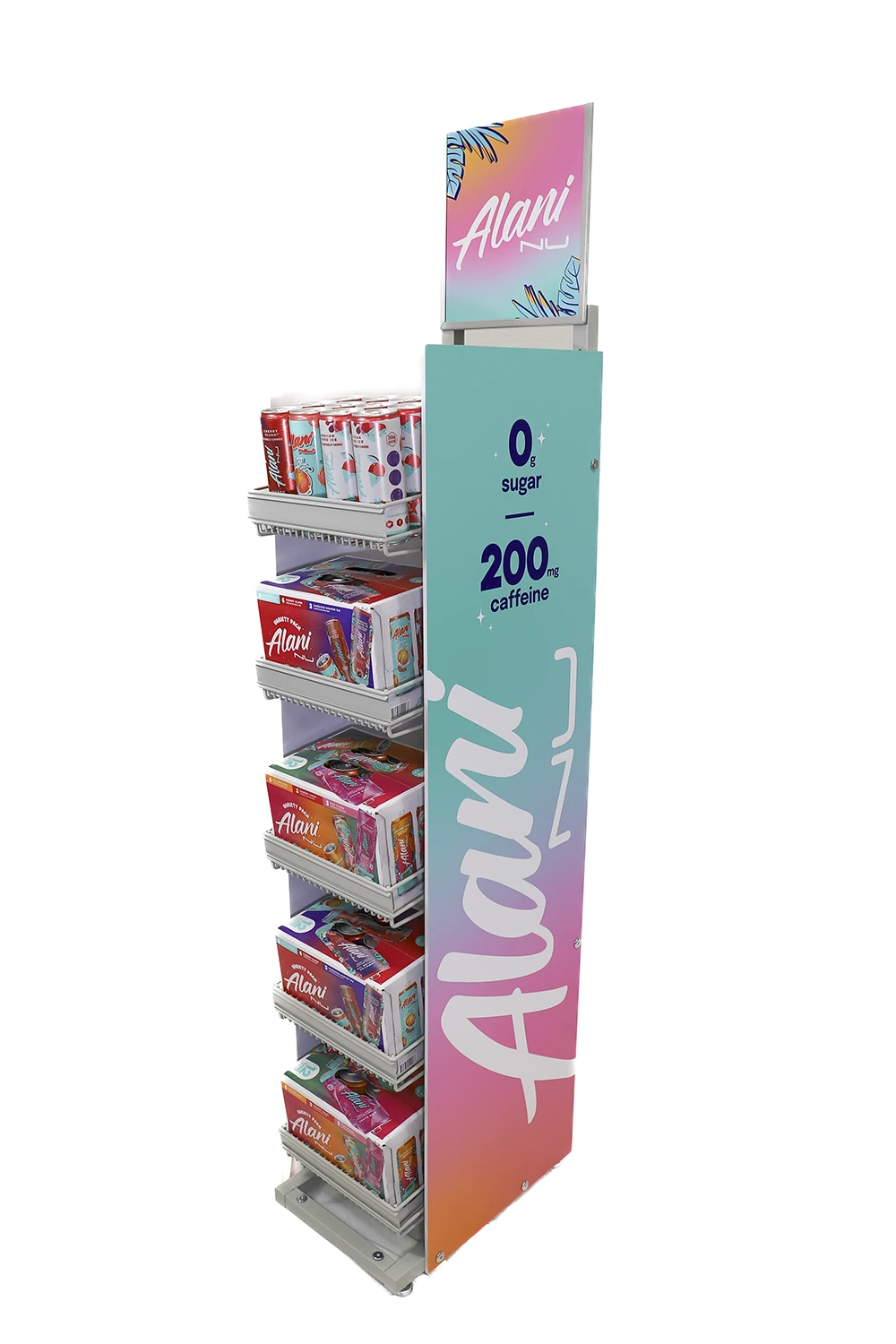 Congo Brands was looking to build awareness for their rapidly growing beverage lines—Prime and Alani Nu—across grocery and convenience store chains nationwide. FRG responded with a cost-effective, durable, and on-brand gravity feed rack that delivered immediate impact. With bold branding, compact footprints, and high visibility, the displays helped drive recognition and movement at retail for both product lines.